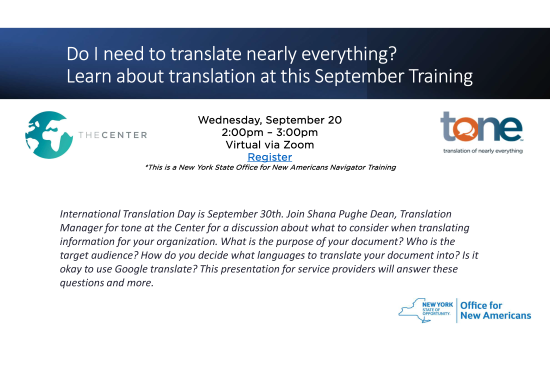 Next week on September 20 at 2:00pm Translation Manager Shana Pughe Dean will provide a training about what to consider when having documents translated for your organization. The training is FREE and open to all community members.